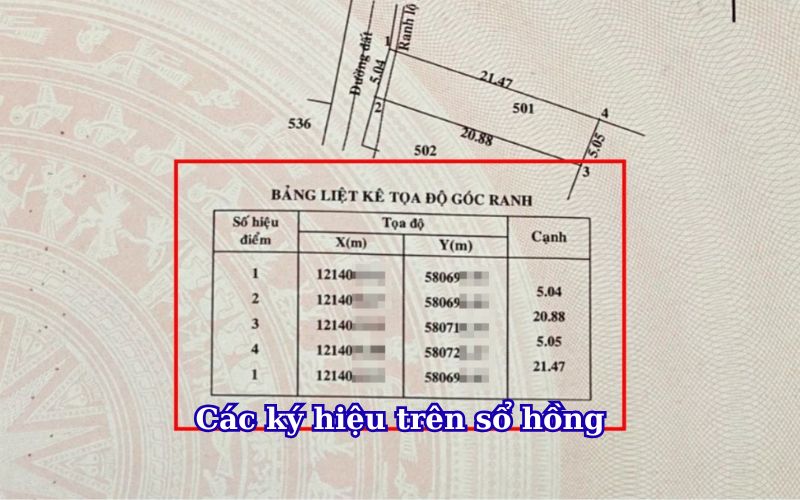 Các ký hiệu trên sổ hồng thể hiện chi tiết đặc điểm, vị trí, ranh giới, mục đích và loại tài sản gắn liền với đất.
